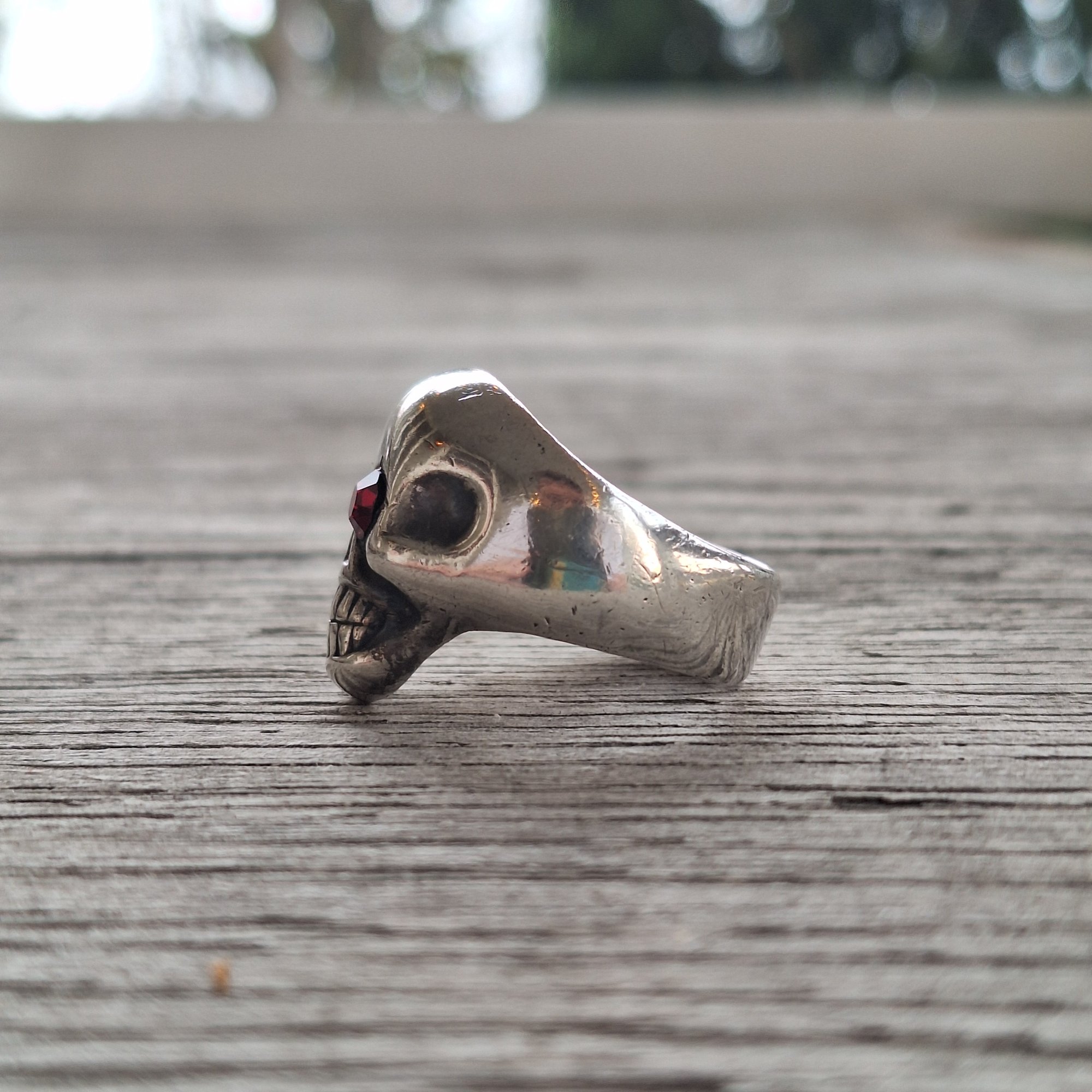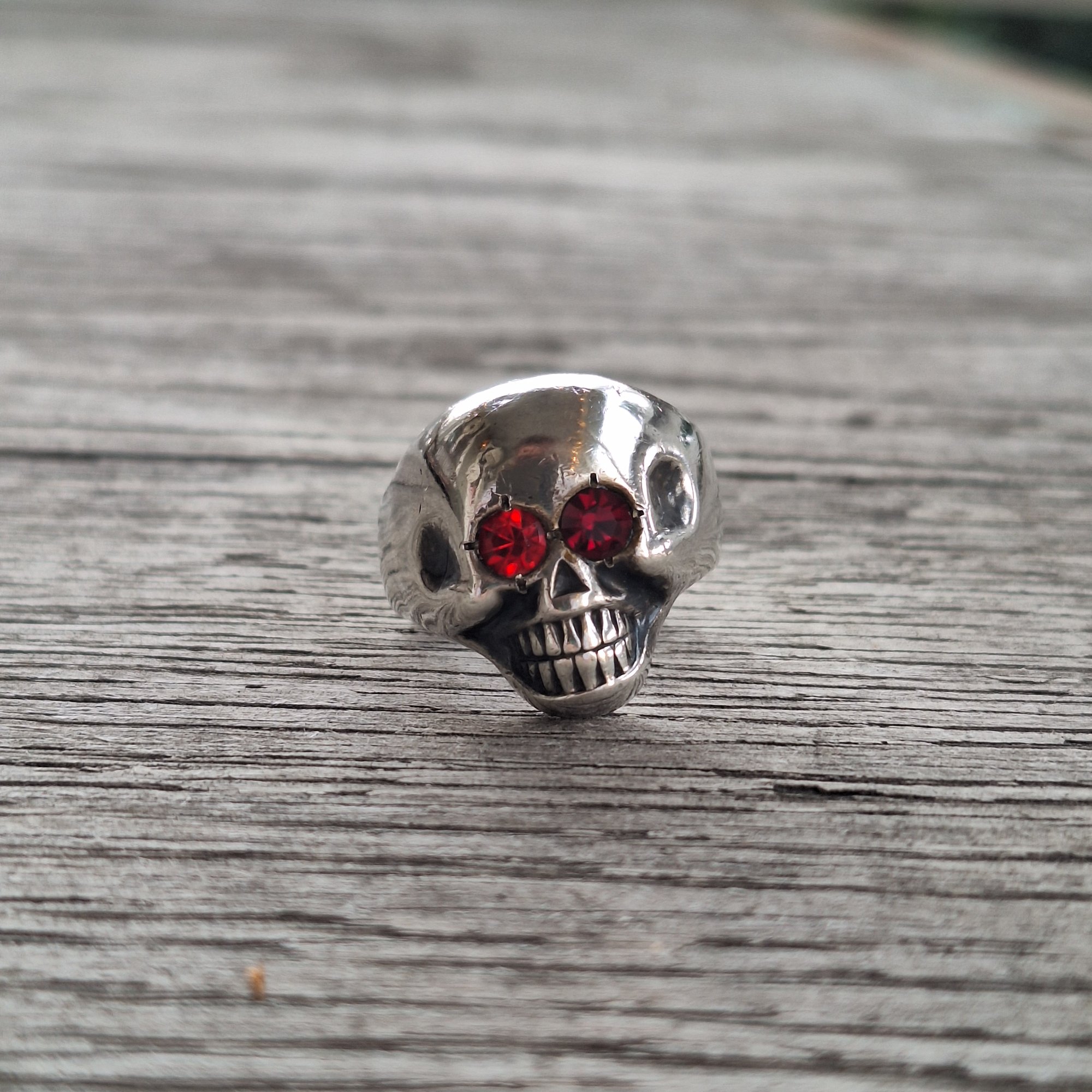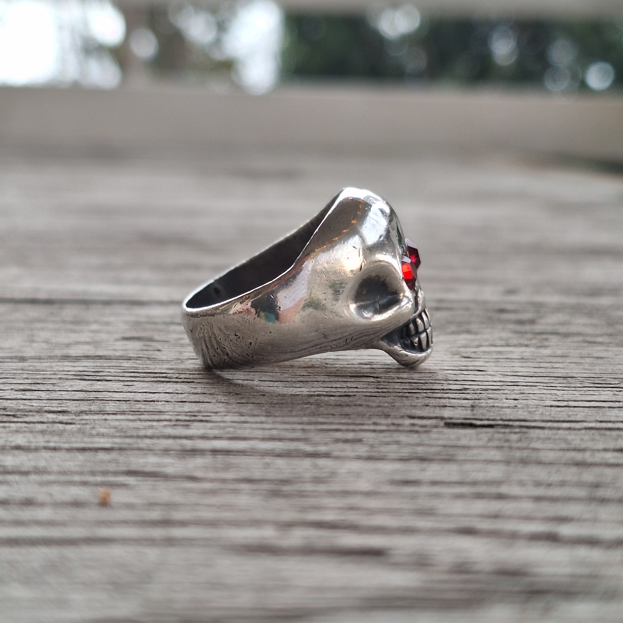 š® Bell Trading Post skull ring with red glass stones set into the eye sockets - ring has been resized at some point through it's journey in time