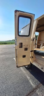 The 60/40 passenger side cargo doors have fixed-glass, and the rear cargo doors have their factory pop-out glass. All the glass are perfect on this van.