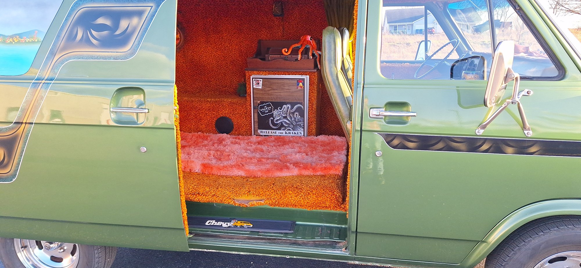 This van was customized in '75 by Rodco Conversions. I was told this model was called the "Swing Machine". Rodco painted both murals, and all of the designs you see on the van.