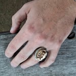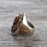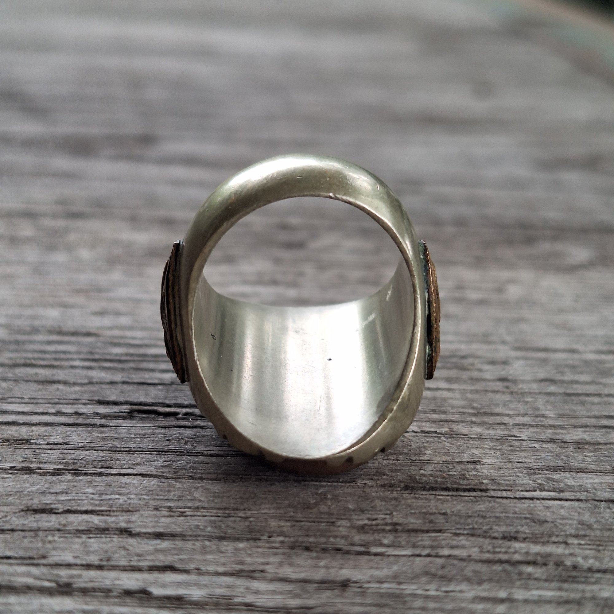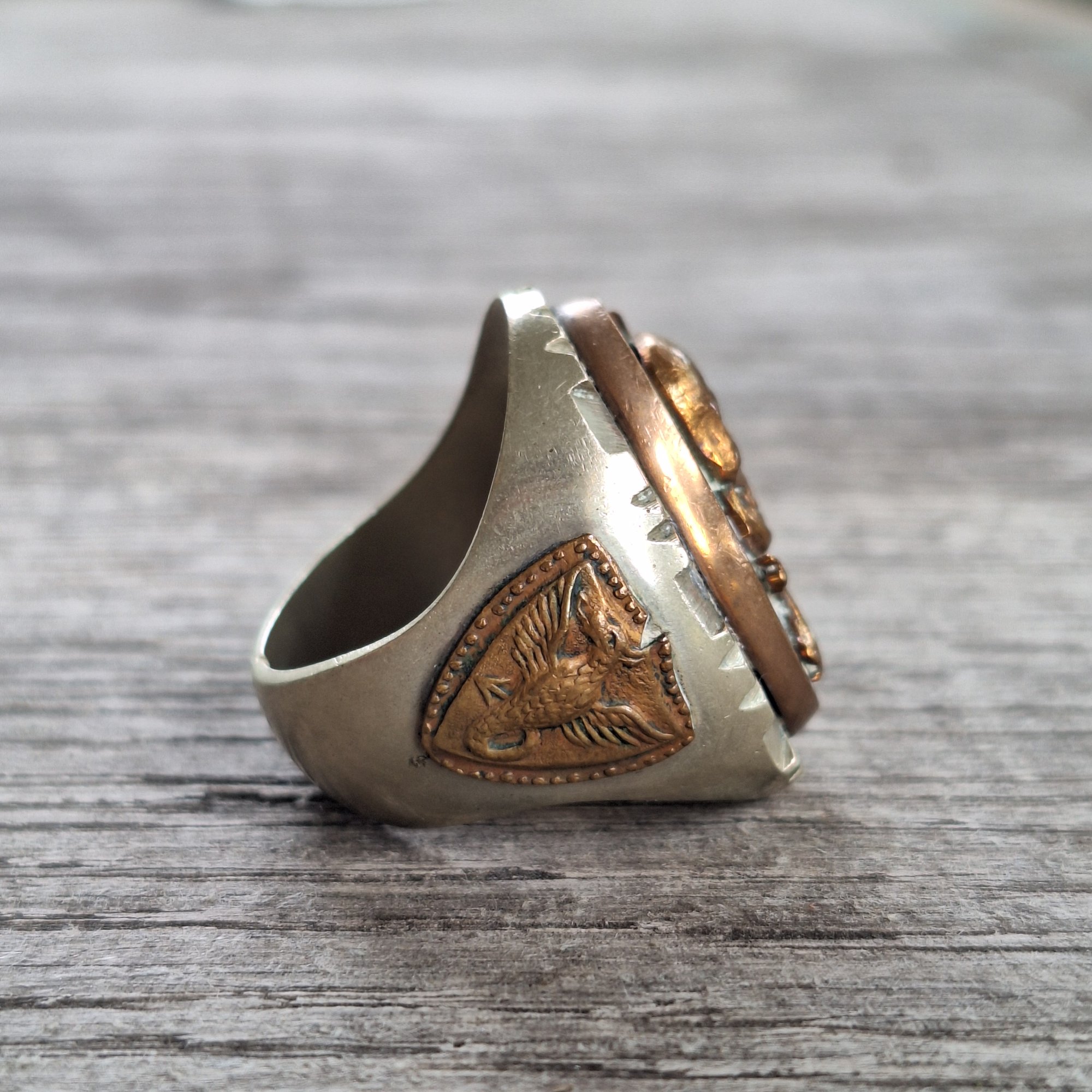 🔮 Mexican souvenir ring with a very rare "Grinning" skull 'n' bones motif and griffin shields adorning both shoulders - what makes this ring even more special is the dagger going through skull, the grinning skull variant with dagger combo is seldom scene - overall condition is mint