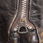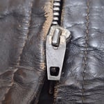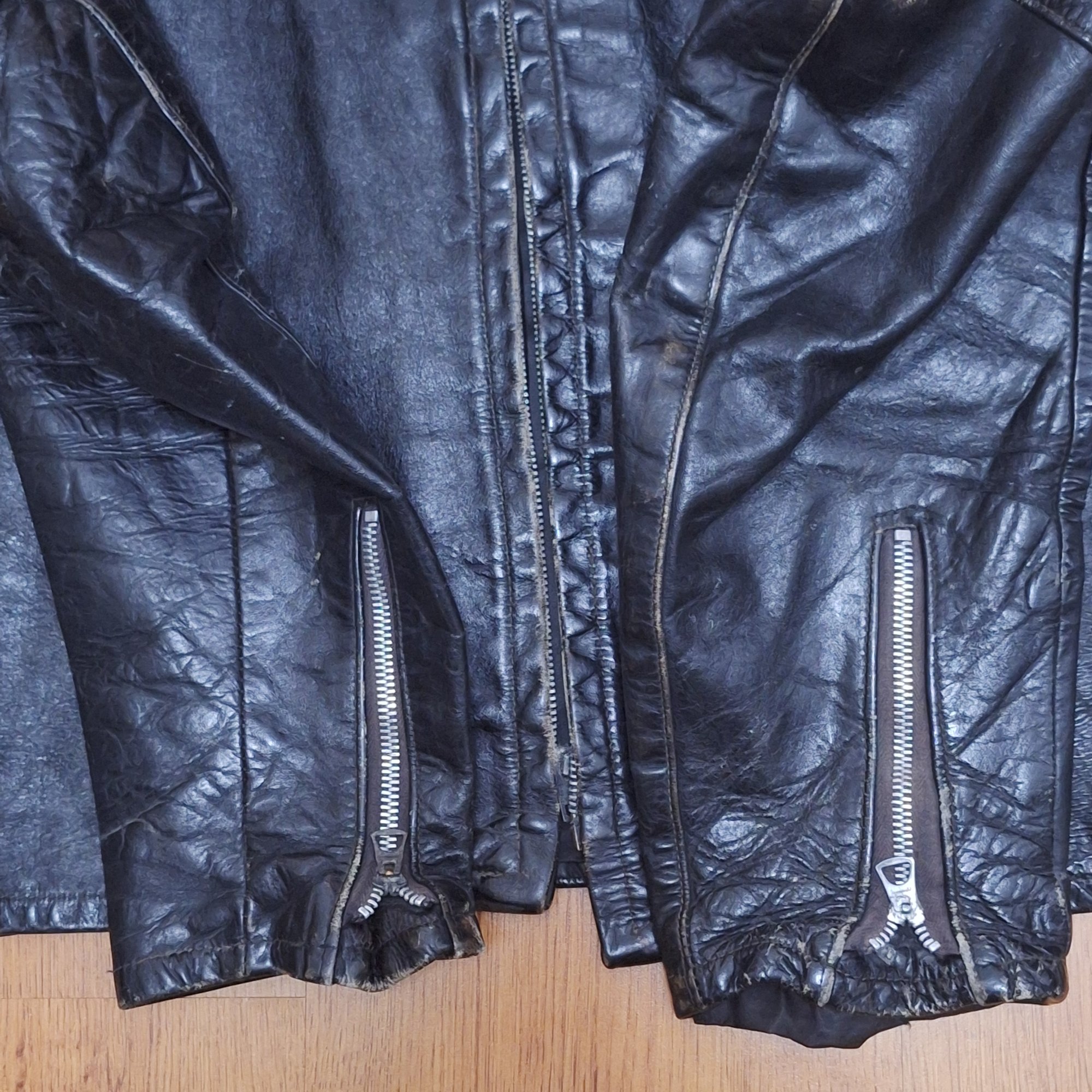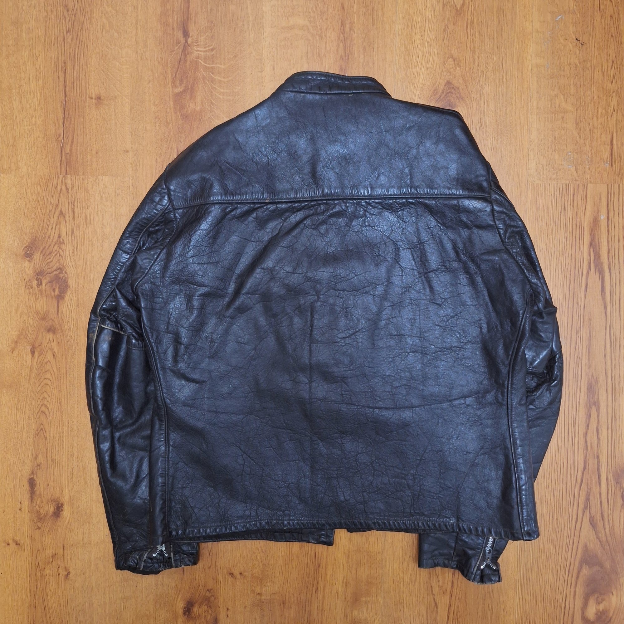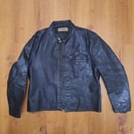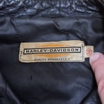 🔮 Vintage black leather (likely steerhide) cafe jacket. Jacket retains original Harley Davidson label and size tag. Original main zipper is a Conmatic, and both sleeve and chest zippers are the original Conmar brand. Male end of main zipper has started to separate at hem, about an inch in length. Main zipper can still be zipped up if done carefully. The chest and sleeve zippers have no issues, all three function well.