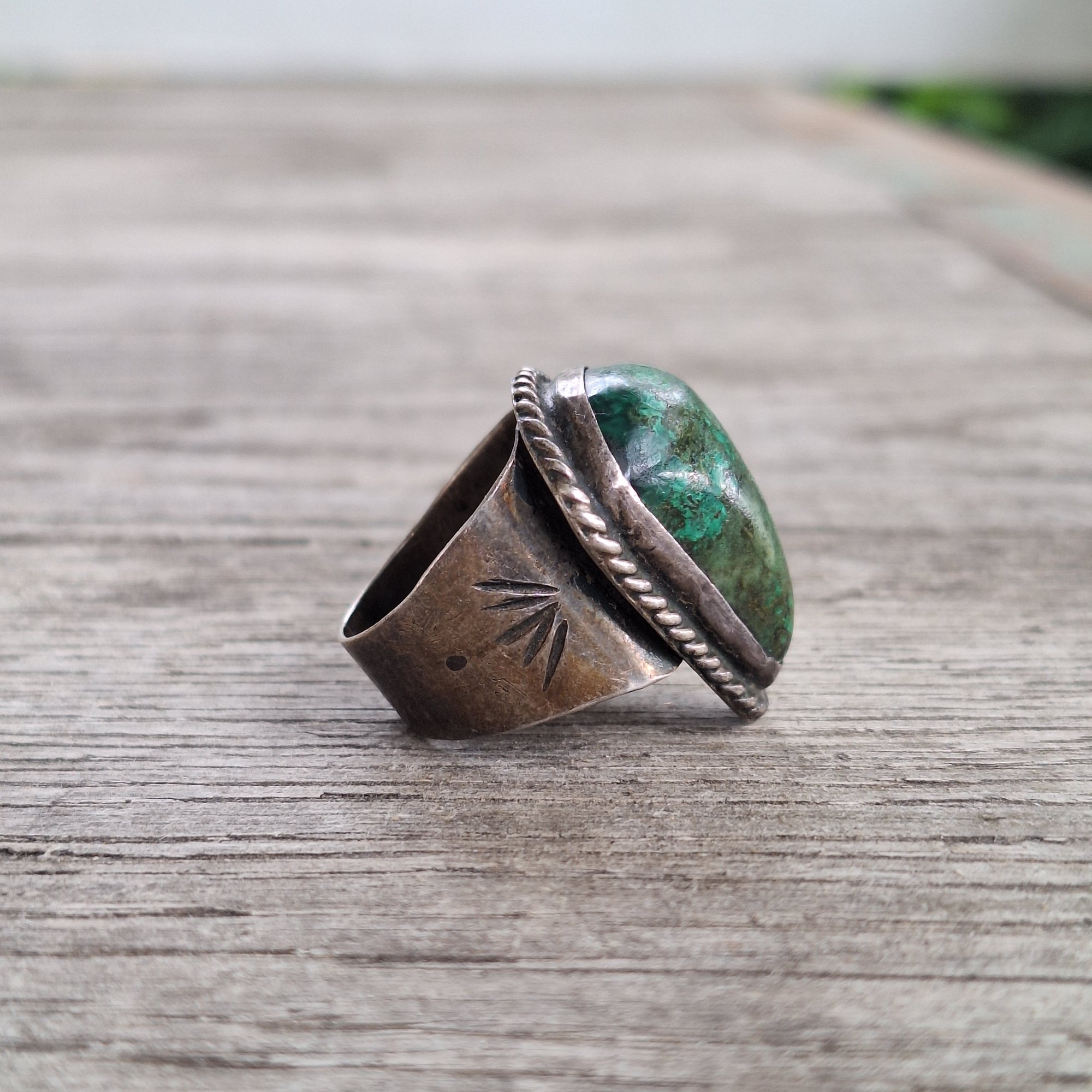 🔮 Southwest chrysocalla ring with hand engraved markings on the shoulders - sits prominently on the knuckle